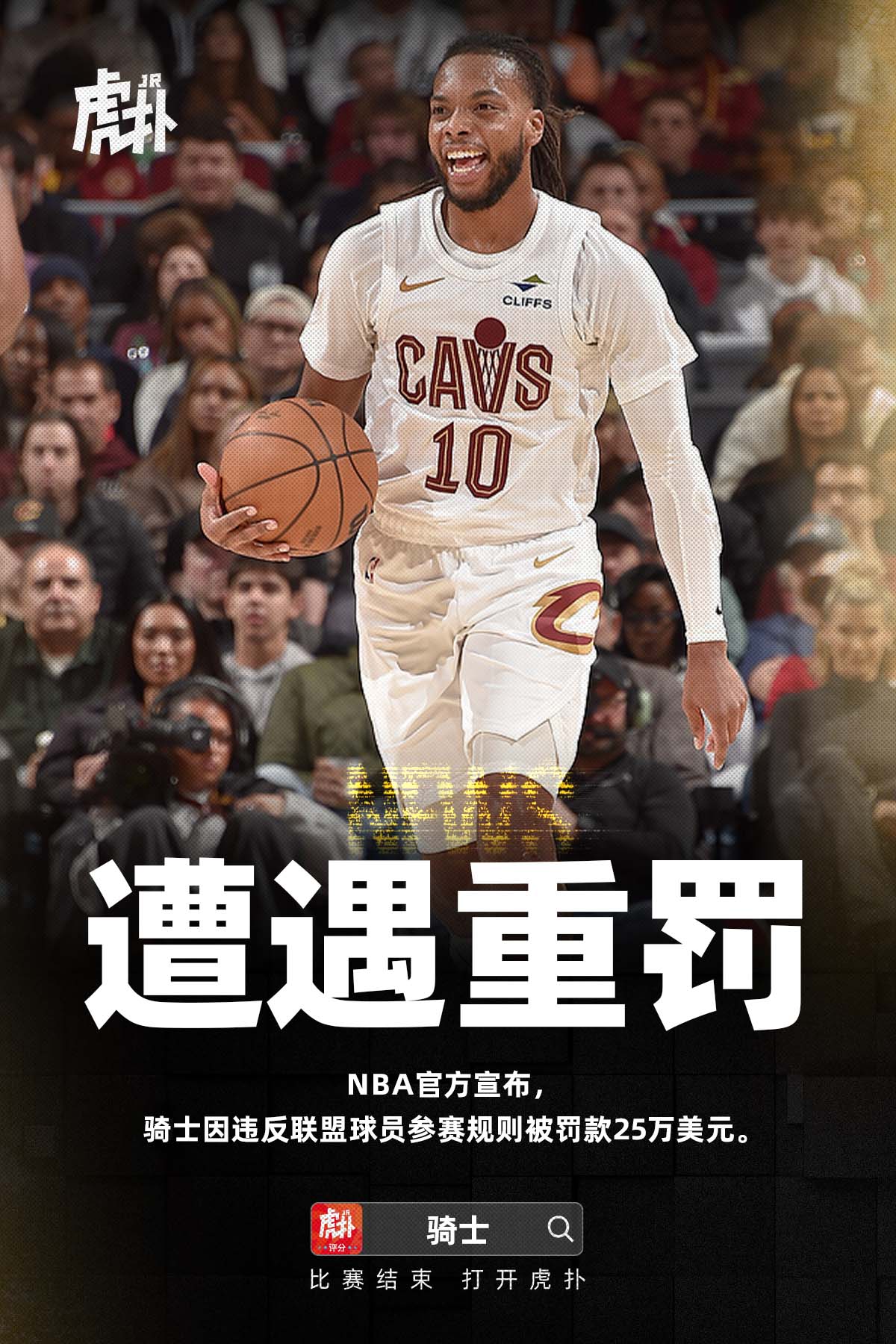 虎撲12月05日訊 NBA官方宣布,騎士因違反聯(lián)盟球員參賽規(guī)則被罰款25萬美元。士因