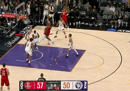 第二節(jié)比賽中,強攻阿門強攻拋投打進拿到12分,拋投火箭上半場59-50領(lǐng)先太陽。打進