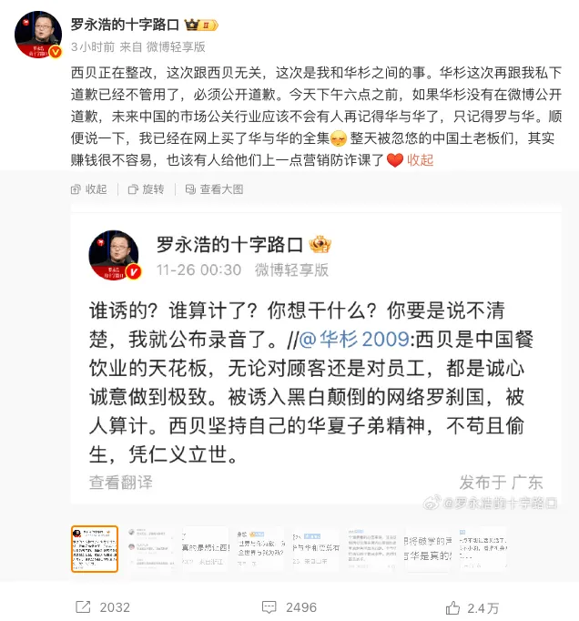 26日,羅永浩回應(yīng)稱:“西貝正在整改,這次跟西貝無關(guān),這次是我和華杉之間的事。華杉這次再跟我私下道歉已經(jīng)不管用了,必須公開道歉。今天下午六點之前,如果華杉沒有在微博公開道歉,未來中國的市場公關(guān)行業(yè)應(yīng)該不會有人再記得華與華了,只記得羅與華。”