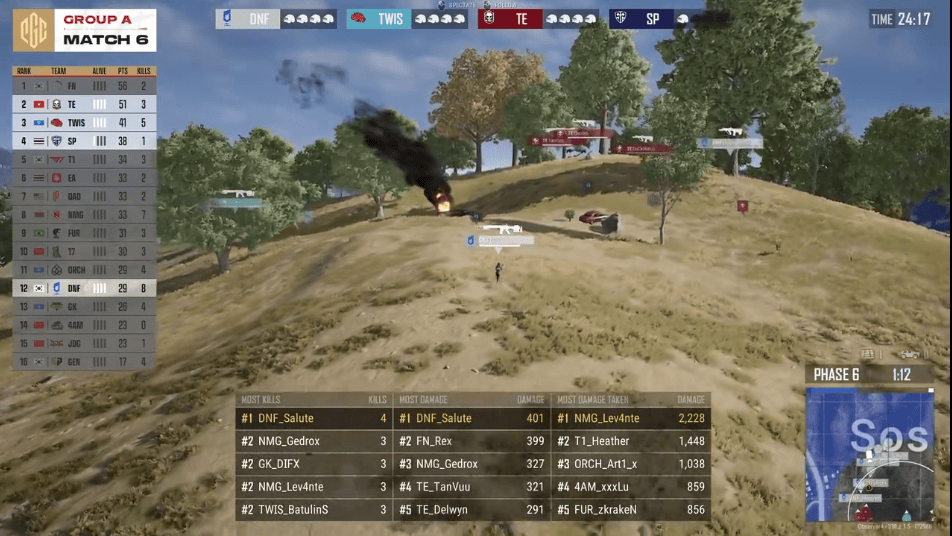 階段6,圈型刷在機(jī)場(chǎng)西北部山地,TE圈邊將SP淘汰出局,同時(shí)DNF也將EA團(tuán)滅。