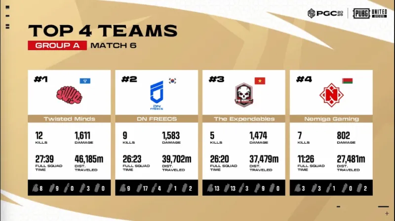決賽圈,TE先與DNF交戰(zhàn),雙方互換多人,TWIS抓住機(jī)會(huì)前來勸架,DNF先被淘汰,隨后SP獨(dú)狼也被藍(lán)圈帶走,最終TE與TWIS決賽圈大戰(zhàn),TE連續(xù)擊倒TWIS兩人,TE拿回人數(shù)優(yōu)勢(shì),TE開車轉(zhuǎn)移但被TWIS打掉,雙方來到二打二,TWIS率先發(fā)現(xiàn)TE一人并擊倒,TanVuu一打二不敵TWIS兩人,TWIS成功吃雞。
