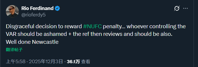 曼聯(lián)名宿里奧-費(fèi)迪南德賽后直接在社媒對(duì)裁判判罰給紐卡點(diǎn)球的決定開噴,言辭非常激烈。