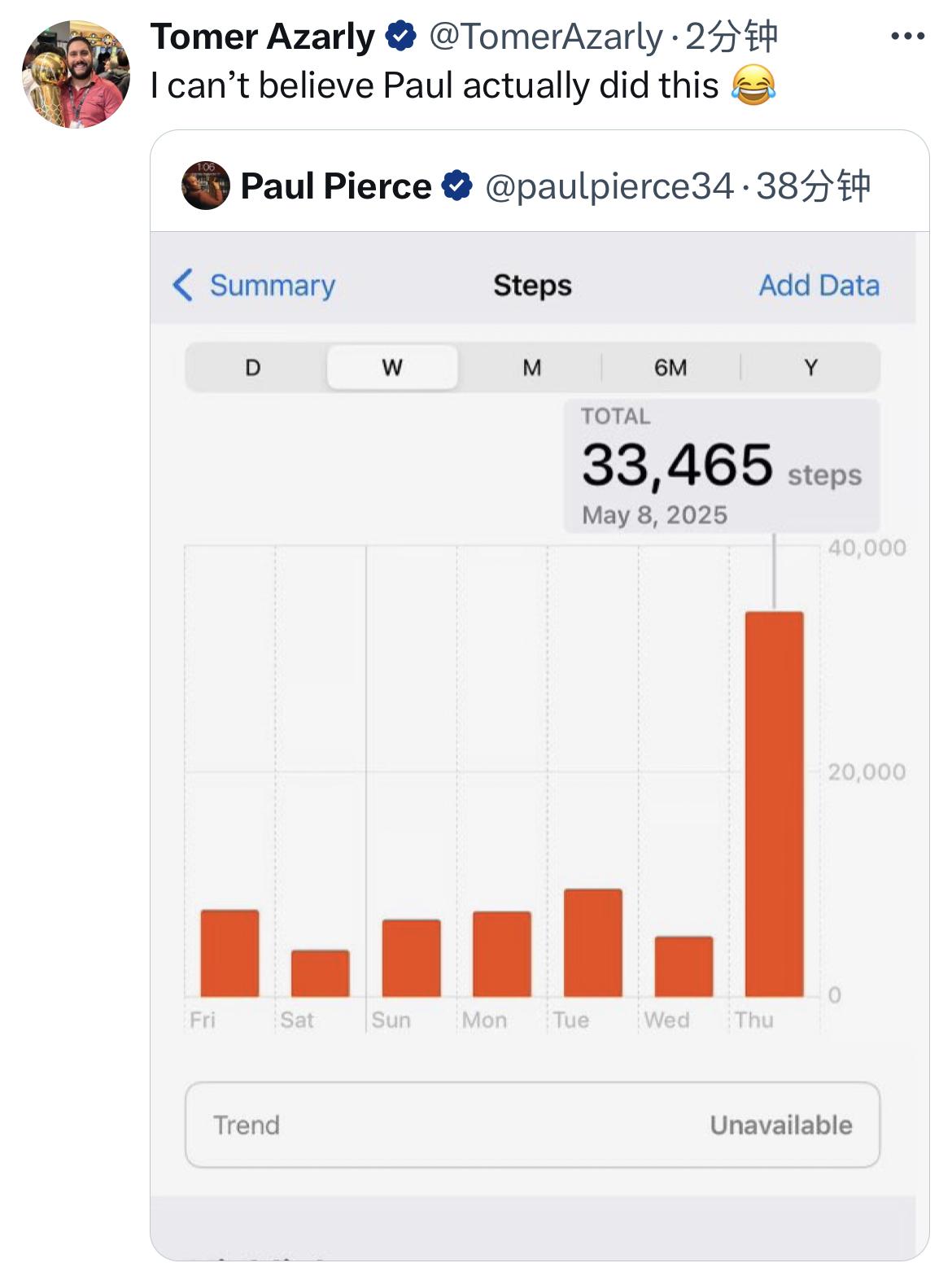 快船跟隊記者Tomer Azarly轉(zhuǎn)發(fā)皮爾斯曬出自己步數(shù)的記轉(zhuǎn)推特并表示:我不敢相信皮爾斯真的這么做了??。