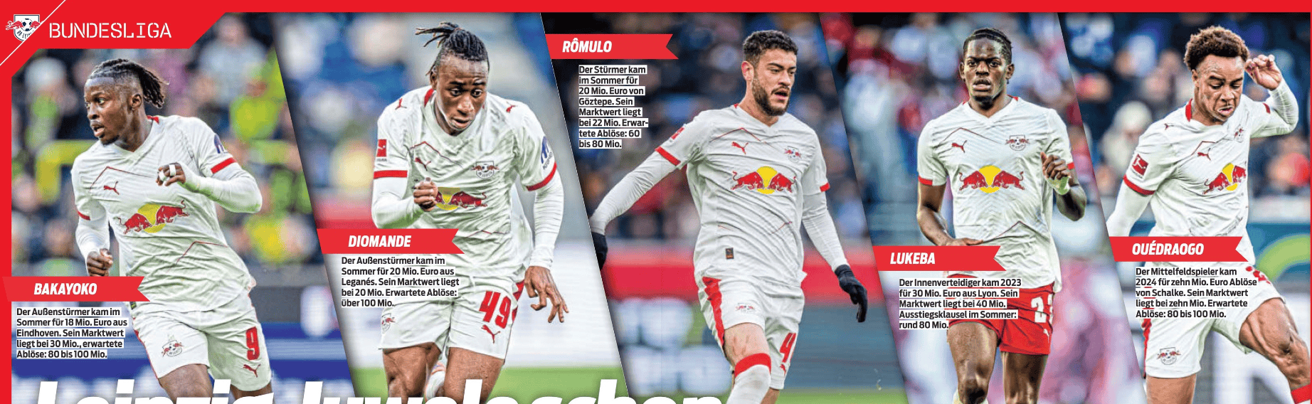 由于萊比錫紅牛擁有俱樂部所有權(quán),每位年輕球星的轉(zhuǎn)會費都可以自由協(xié)商。唯一的例外是卡斯特羅-盧克巴(22歲)。據(jù)《體育圖片報》報道,這位中后衛(wèi)今夏的解約金約為8000萬歐元。