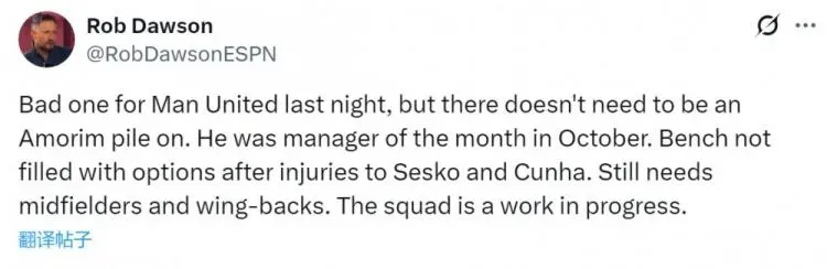 對(duì)于曼聯(lián)的引進(jìn)失利,記者Rob Dawson社媒寫道:“曼聯(lián)昨晚輸球確實(shí)很糟糕,中場但沒必要對(duì)阿莫林群起而攻之,他可是十月份的月度最佳主帥?!?/p>