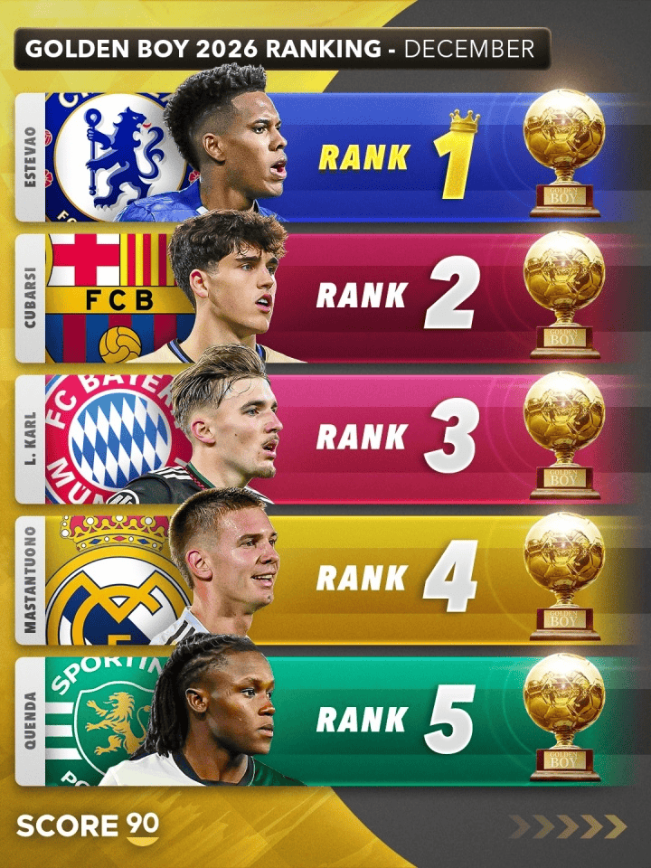 虎撲12月04日訊 著名媒體Score90列出了2026年金童排名預(yù)測(cè),埃斯特旺居首,庫(kù)巴西、卡爾分列二三。