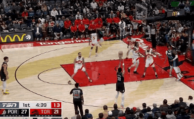 NBA常規(guī)賽,開拓者對(duì)陣猛龍的球分比賽正在進(jìn)行中。
