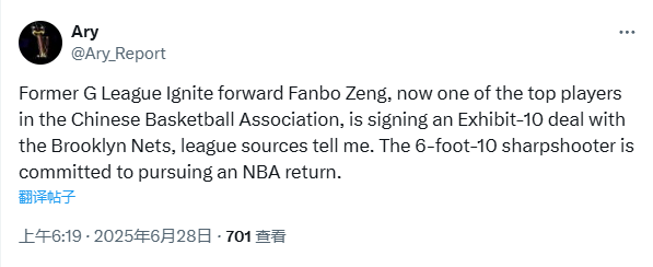 虎撲06月28日訊 美記Ary報(bào)道:據(jù)聯(lián)盟消息人士透露,前發(fā)展聯(lián)盟點(diǎn)燃隊(duì)前鋒曾凡博,現(xiàn)為中國(guó)籃球協(xié)會(huì)頂級(jí)球員之一,將與布魯克林籃網(wǎng)簽訂一份Exhibit-10合同。這位身高2米08的神射手致力于重返NBA。不過(guò)隨后不久,該記者刪除了該條報(bào)道。