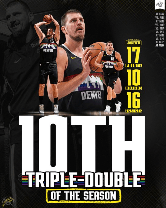 [流言板]三雙已上雙!掘金官方:約基奇本賽季已第10次拿到三雙