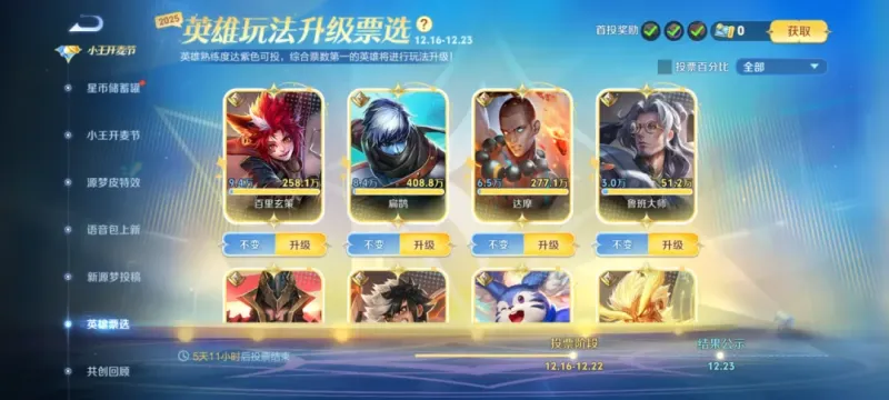 此外,一年一次的英雄玩法升級(jí)投票已經(jīng)進(jìn)行了一天,其中前三的最新票數(shù)分別如下:(升級(jí)票數(shù)-不變票數(shù)=總票數(shù))