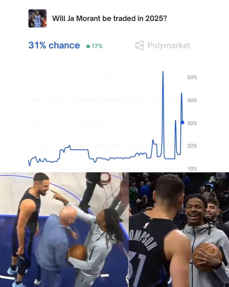 知名賠率網(wǎng)站Polymarket發(fā)布動態(tài),賈-莫蘭特在與克萊-湯普森發(fā)生言語沖突后,莫蘭被交易的交易概率已大幅飆升,一度突破50%,幅飆目前穩(wěn)定在31%。流言萊沖率