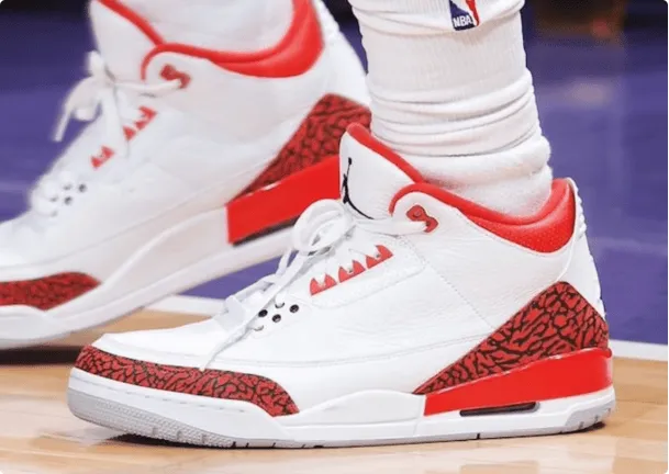 在2018賽季NBA收官之際,克里斯·保羅穿上了一雙此前從未公開的Air Jordan 3 Red Cement PE配色,與他的快船隊球衣完美搭配。這雙鞋在鞋頭和鞋跟的爆裂紋圖案上采用了紅色細(xì)節(jié),鞋墊、鞋領(lǐng)和TPU鞋眼片也均為純紅色。鞋身其余部分則采用經(jīng)典的白色荔枝紋皮革。