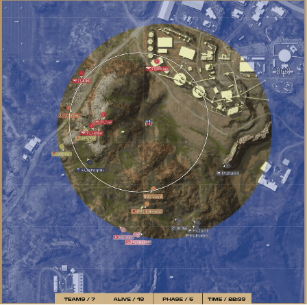 階段6,圈型刷到軸承高地南部山坡,T1占據(jù)高點(diǎn)絕對優(yōu)勢,連狙連續(xù)抽靶拿下多分,圈邊FN與EA發(fā)生沖突,F(xiàn)N依靠高點(diǎn)優(yōu)勢將FN淘汰出局。
