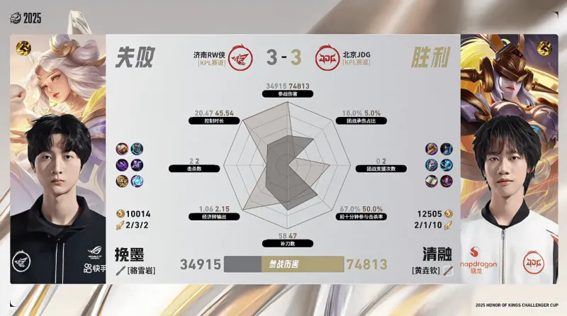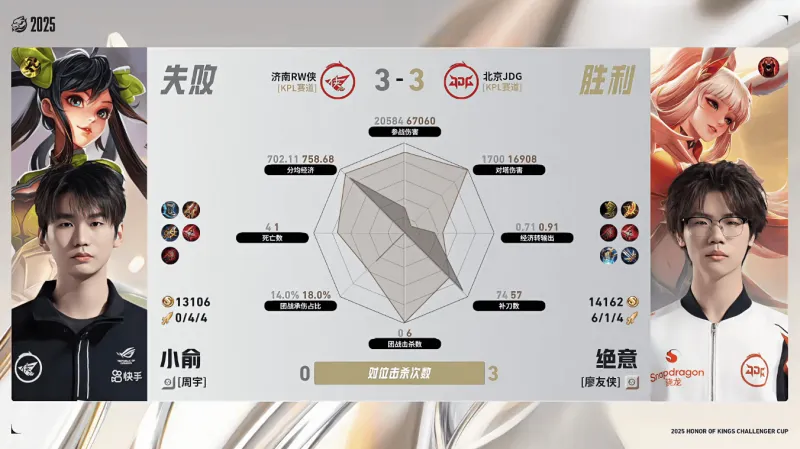 虎撲12月14日訊 JDG/RW俠第六局?jǐn)?shù)據(jù)對(duì)比:絕意公孫離對(duì)位單殺三次