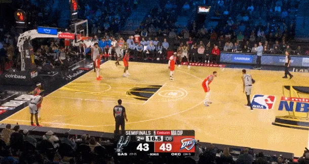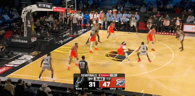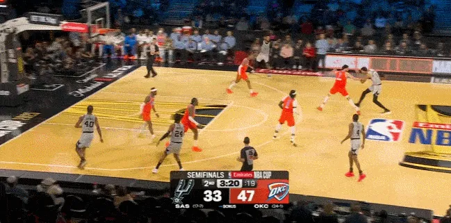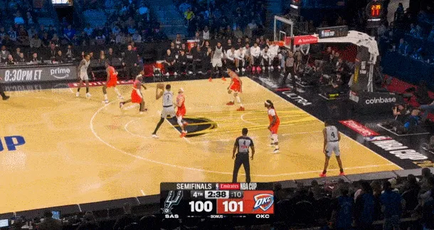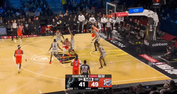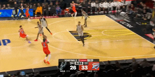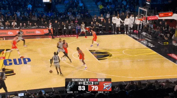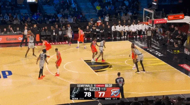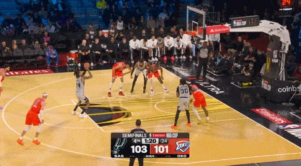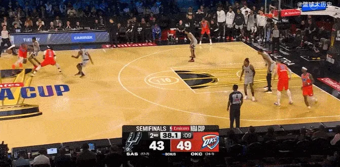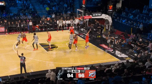 ——剩下3分52秒前,文班亞馬再次上場,此時馬刺31-47落后16分(全場最大分差),然后又是不到4分鐘,馬刺打了雷霆一波15-2,將分差追到3分