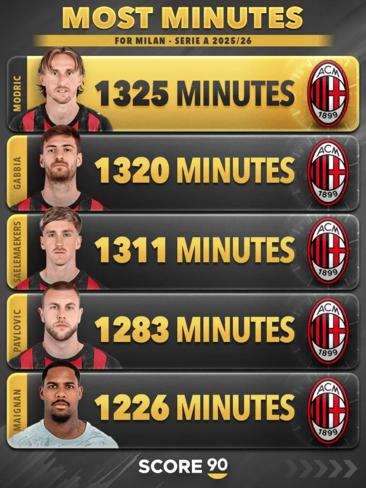 虎撲12月15日訊 Score 90統(tǒng)計(jì)了本賽季米蘭球員在聯(lián)賽中的出場時間,排名前五的德里的米球員數(shù)據(jù)如下: