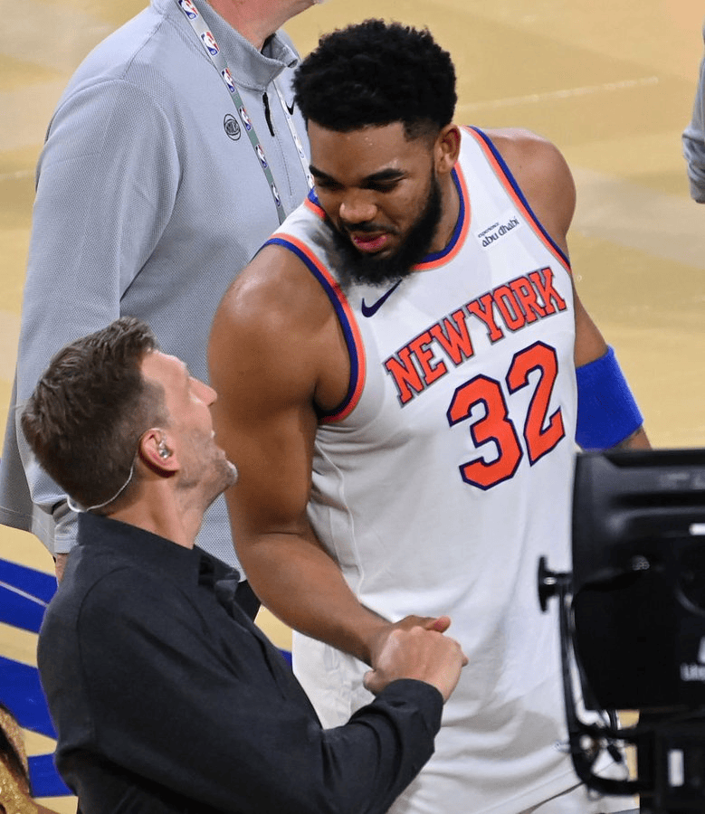 賽后,投籃尼克斯在官方社交媒體上曬出了唐斯與NBA名宿德克-諾維茨基握手的板尼照片,并配文:“史上最會投籃的克斯克唐兩個大個子。”