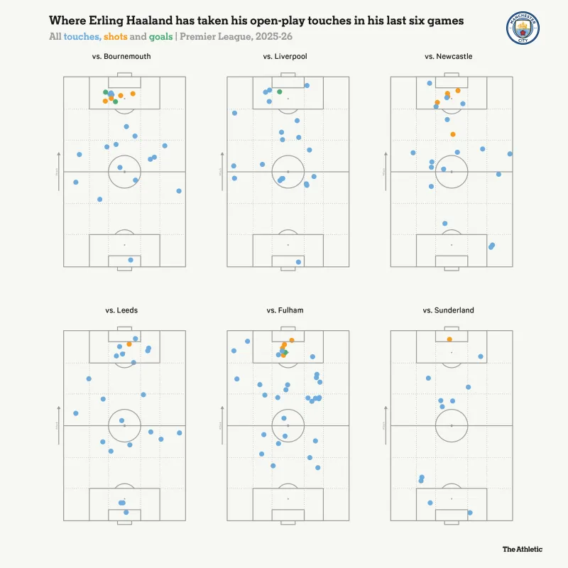 哈蘭德在英超聯(lián)賽 平均每90分鐘觸球24.2次,其中9.6次在進(jìn)攻三區(qū)。更重要的是,他在對(duì)方禁區(qū)內(nèi)平均每90分鐘觸球7.1次,這表明在曼城目前的戰(zhàn)術(shù)體系中,他更像是一位傳統(tǒng)的9號(hào)球員,積極與后衛(wèi)對(duì)抗,贏得空中對(duì)抗,統(tǒng)治禁區(qū),但在禁區(qū)外的活動(dòng)則相對(duì)有限。