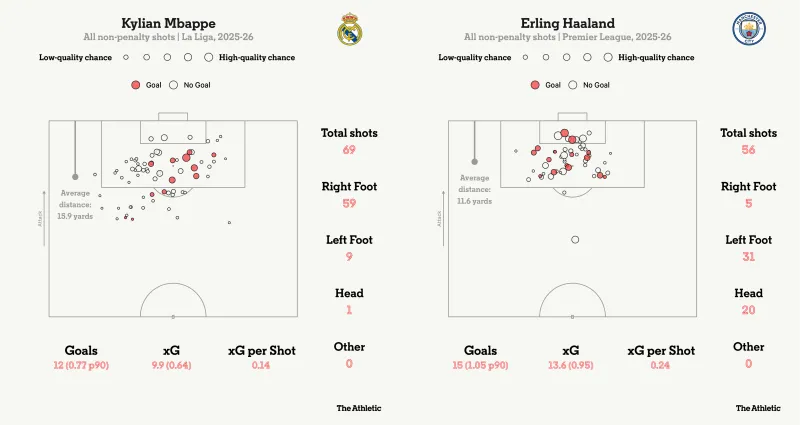下圖為本賽季運(yùn)動(dòng)站射門(mén)比較 (左) 姆巴佩 vs (右) 哈蘭德