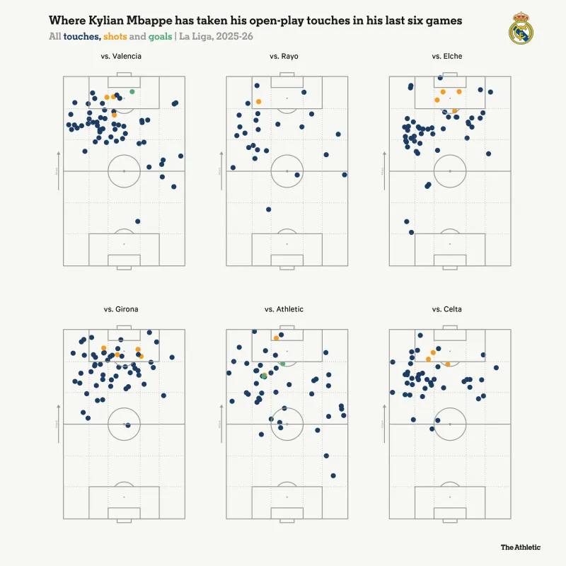 姆巴佩在西甲聯(lián)賽 平均每90分鐘觸球54.6次,略高于2024-25賽季的53.9次。其中相當(dāng)一部分(每90分鐘38.4次)發(fā)生在進(jìn)攻三區(qū),但他平均每90分鐘在對(duì)方禁區(qū)內(nèi)的觸球次數(shù)僅為8.5次,是過(guò)去五個(gè)聯(lián)賽賽季以來(lái)的最低值。從皇馬最近六場(chǎng)聯(lián)賽的活動(dòng)圖來(lái)看,他經(jīng)常在邊路活動(dòng),遠(yuǎn)離禁區(qū)。