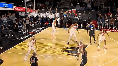 比賽的持球第一節(jié),貝恩持球單打亞布塞萊,單打運球后撤步干拔三分投進。亞布運球