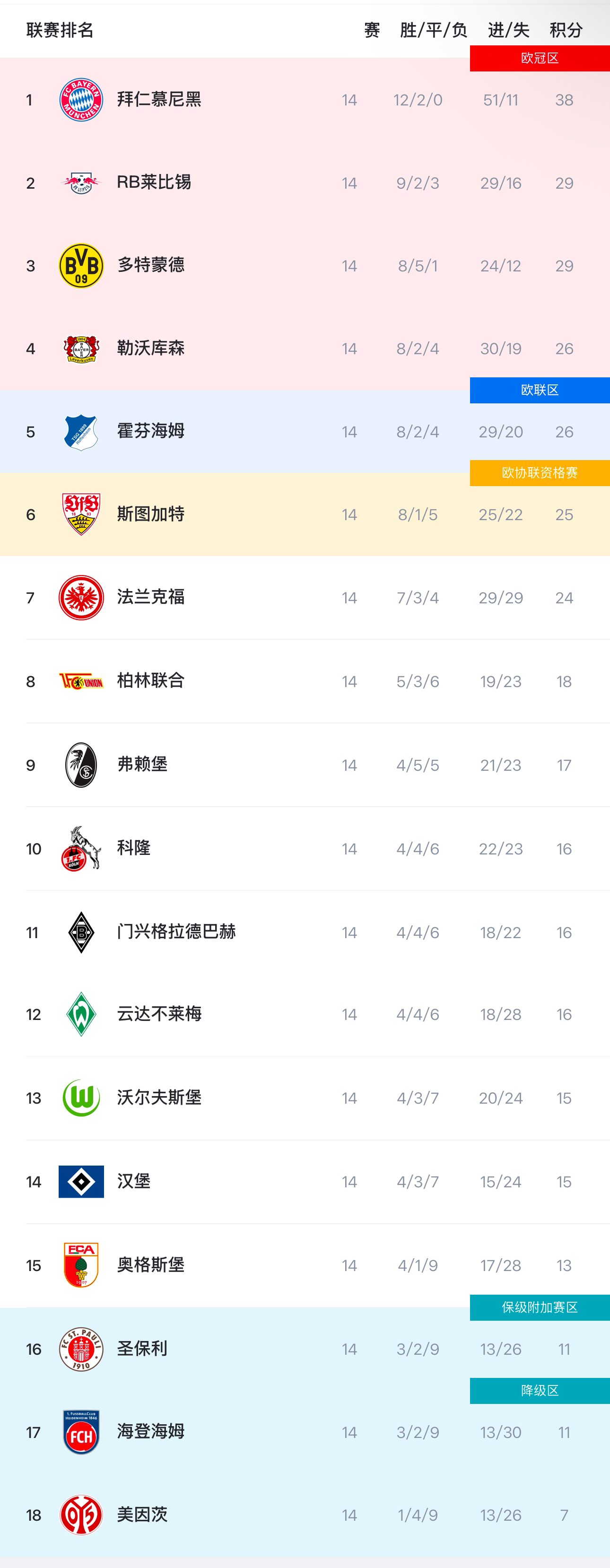 虎撲12月15日訊 昨夜今晨德甲第14輪的最后3場比賽結束,積分榜的甲積甲多形勢出現(xiàn)新的變化。