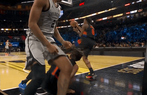 虎撲12月17日訊 NBA杯決賽,尼克斯對陣馬刺的下籃比賽正在進行中。