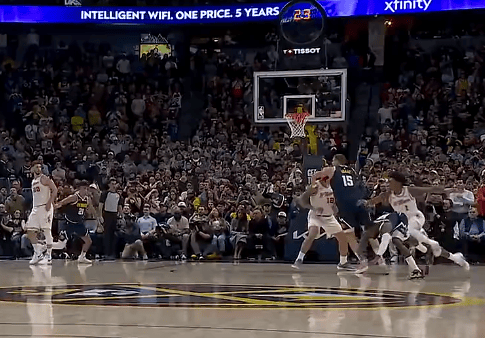NBA常規(guī)賽,掘金主場(chǎng)迎戰(zhàn)火箭的阿門比賽正在進(jìn)行中。