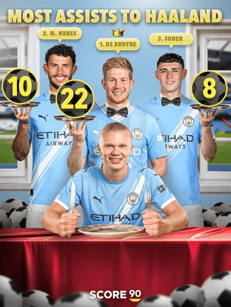 虎撲12月15日訊 Score 90盤點(diǎn)了給哈蘭德送上最多次助攻的曼城球員,詳情如下: