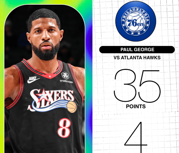 喬治今日砍下35分,創(chuàng)下76人生涯單場得分新高,此前最高是2024年12月17日客場對陣黃蜂砍下33分。