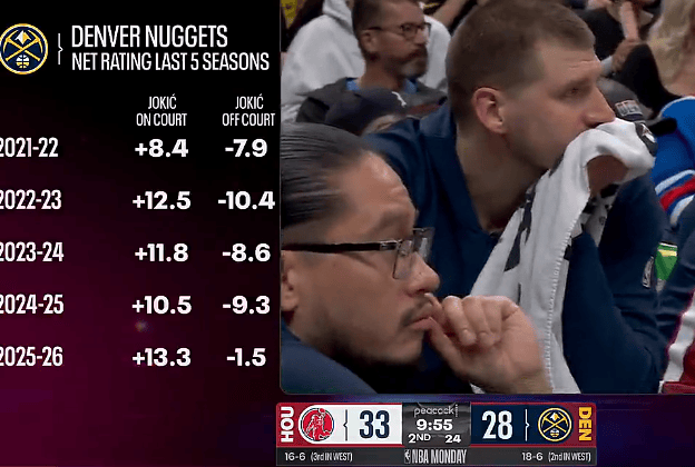 2025~26賽季 約基奇在場+13.3分,不在場-1.5分