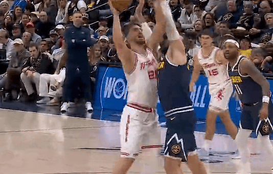 NBA常規(guī)賽,火箭客場對陣掘金的轉(zhuǎn)身造犯比賽正在進(jìn)行中。