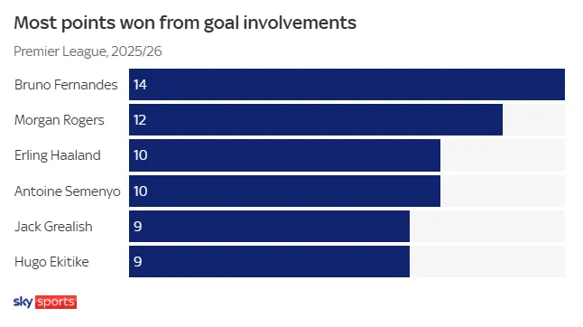 隨后是格拉利什和?;倏?,兩人均為球隊帶來9個積分。格拉利什本賽季英超已有6次進(jìn)球參與,且全部直接影響比賽結(jié)果,在積分貢獻(xiàn)占比榜單中達(dá)到38%。埃基蒂克則在有限的出場和進(jìn)球參與次數(shù)下,多次在關(guān)鍵場次中通過進(jìn)球或助攻改變比賽走向。