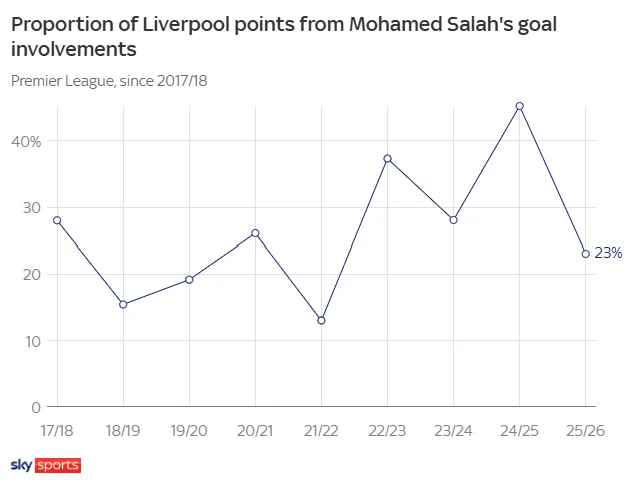 本賽季,薩拉赫在英超比賽中貢獻(xiàn)了4球3助攻。雖然產(chǎn)出有所下降,但這些貢獻(xiàn)仍贏得了利物浦23%的積分。