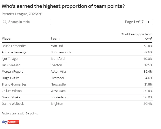 在積分貢獻(xiàn)占比榜單中,布倫特福德前鋒伊戈爾-蒂亞戈排名第三。他本賽季的11個進(jìn)球為球隊贏下了40%的聯(lián)賽積分,是隊內(nèi)最重要的得分點之一。進(jìn)入該榜單前十的還包括吉馬良斯、扎卡、卡勒姆-威爾遜以及維爾貝克,幾人均在多場比賽中通過關(guān)鍵進(jìn)球或助攻直接為各自球隊帶來積分。