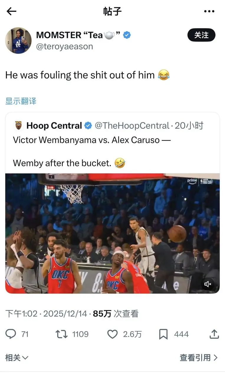 賽后,防守伊森媽媽發(fā)推吐槽卡魯索的文班文班防守:他(卡魯索)把文班的翔都給犯出來了??