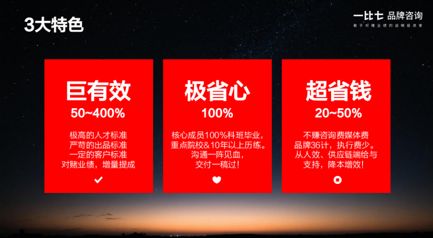 【怕咨詢公司 “收了錢不辦事”?】 很多老板怕找咨詢公司 “踩坑”:交了大筆咨詢費(fèi),換來的方案不落地,錢花了事沒成。一比七直接打破 “信任魔咒”——按業(yè)績增量分成,品牌方啟動費(fèi)需市場價的 20-50%,等真做出業(yè)績增長,再按約定分成。比如有個母嬰用品企業(yè),之前找其他咨詢公司花幾十萬做規(guī)劃,結(jié)果沒法落地,業(yè)績越做越差。和一比七合作,啟動費(fèi)只花原來的 1/3,團(tuán)隊(duì)先做市場研究,鎖定 “分齡輔食工具” 藍(lán)海;再做產(chǎn)品規(guī)劃(“按月齡定制輔食碗勺套裝”);品牌形象突出 “** + 科學(xué) + 媽媽省心”;營銷在媽媽群、小紅書做**傳播。三個月后,套裝成爆款,業(yè)績漲 200%,分成時企業(yè)主直嘆 “太值了”!而且團(tuán)隊(duì) ** 科班 + 20 年實(shí)戰(zhàn),方案一次性過稿,滿意度 99%+,從不爛尾,中小企業(yè)完全沒風(fēng)險!